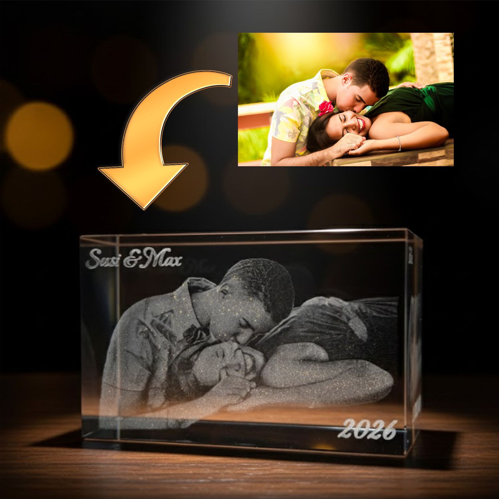 Lieferumfang: 1x Personalisierter 3D-Kristallglas-Quader, 1x Geschenkverpackung
